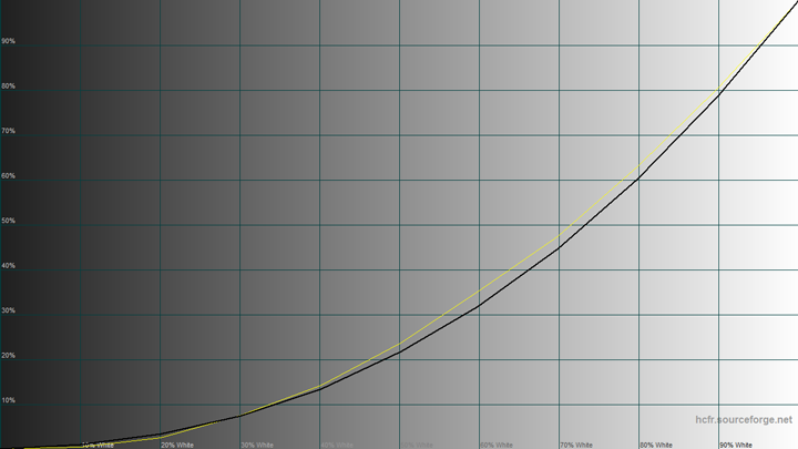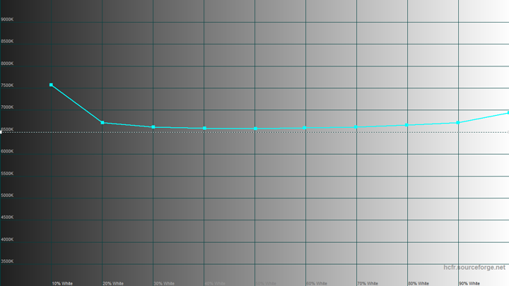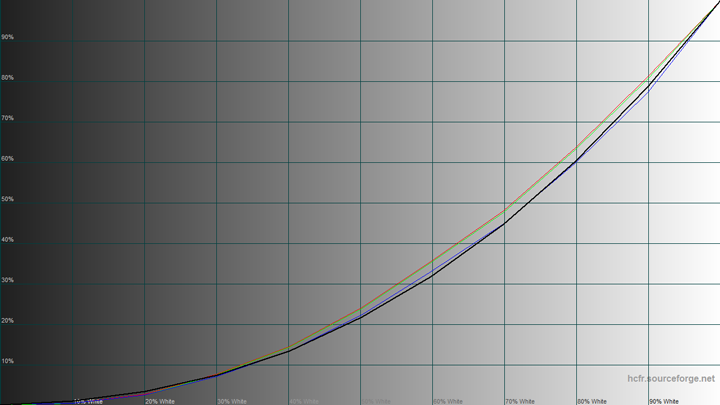 Общие настройки матрицы находятся на приемлемом, как для игровой модели, уровне. Цветовой охват покрывает 62% цветового пространства sRGB, со смещением треугольника в сторону холодных оттенков. Цветовая температура близка к эталонным 6500 кельвинам при интенсивности яркости подсветки от 20% до 70%. Гамма-кривые расположились выше референсной кривой, что свидетельствует о незначительном снижении контраста выводимого изображения.