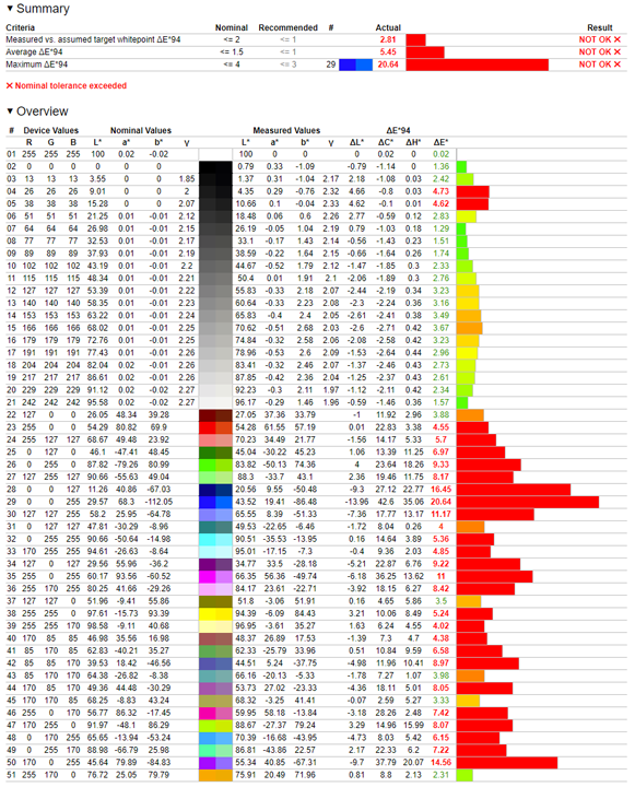 Согласно утилите Argyll, максимальное отклонение цветопередачи достигает 20,84 единиц, при среднем значении в 5,45 единицы.