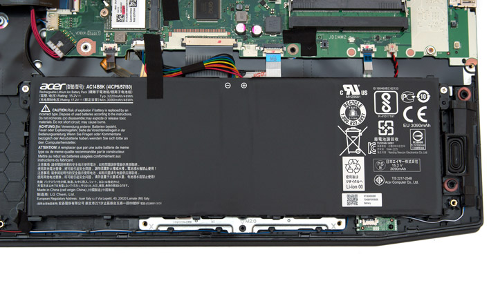 Внутренняя компоновка Nitro 5 (AN515-41) схожа с собратьями на платформе от Intel. Система охлаждения состоит из продолговатого радиатора, пары радиальных вентиляторов, двух медных тепловых трубок и теплораспределительных пластин на ключевых элементах. Через заднюю крышку ноутбука пользователь имеет быстрый доступ к апгрейду оперативной памяти или замене штатного 2,5-дюймового накопителя.