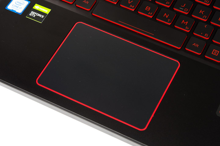 У ноутбука полноформатная большая клавиатура с цифровым блоком. Все кнопки и зона тачпада имеют красную окантовку.