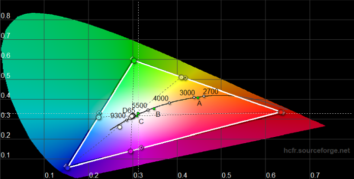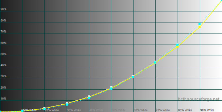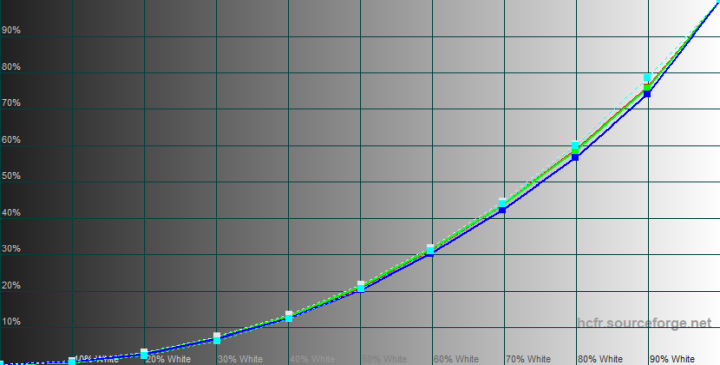 Матрица обеспечивает высокий охват цветового пространства sRGB в 97 %. Цветовая температура около 7300 К, общая гамма может быть сдвинута в сторону холодных цветов, но это едва заметно. Все гамма-кривые близки к эталонным значениям.