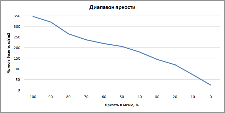 Яркость регулируется в диапазоне от 23 до 348 кд/м². Коэффициент контрастности стабилен на уровне около 828:1.