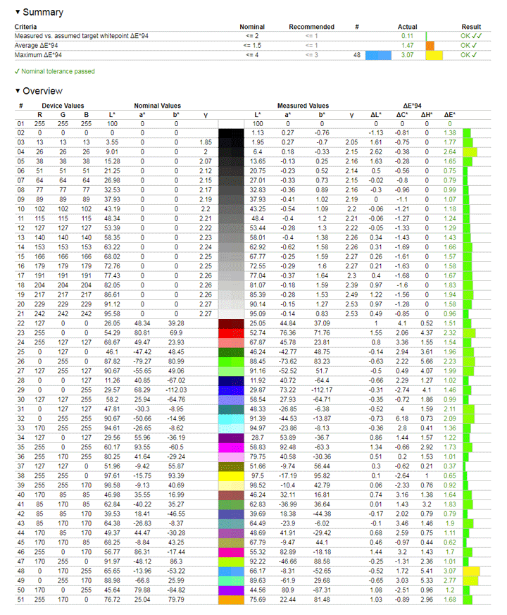 Согласно измерениям утилита Argyll показывает среднее отклонение цветопередачи DeltaE менее 2 единиц, что является отличным результатом.
