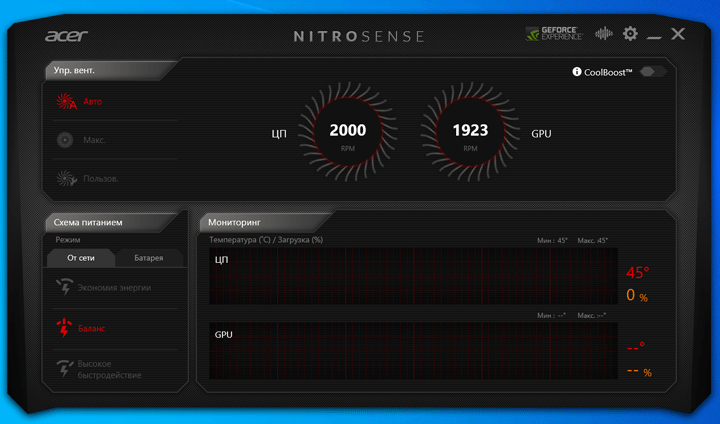 Кратко поговорим о специальном программном обеспечении для ноутбуков Acer Nitro 7. Самой важной утилитой является Acer NitroSense. Тут наглядно представлены данные о скорости вентиляторов и рабочие температуры, есть быстрое переключение режимов производительности/энергопотребления, можно менять режимы работы вентиляторов. Если вы хотите немного улучшить общее охлаждение без серьезного изменения уровня шума, используйте функцию CoolBoost, которая увеличит скорость вентиляторов на 10%. Есть режим максимальной скорости и ручного управления.