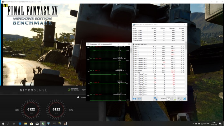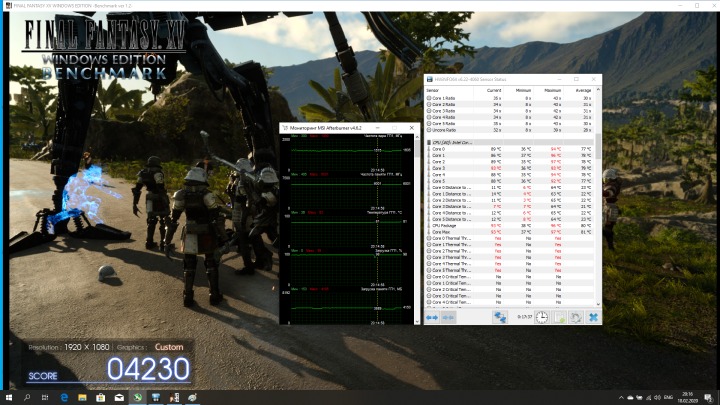 В обычных играх пиковые температуры CPU могут быть еще выше. 20-минутный тест Final Fantasy XV: Windows Edition прогрел процессор до 92–97 °С. Но после снижения частот ядер до 3,0–3,5 ГГц температуры опустилась ниже планки в 90 °С. Ядро видеокарты работало на частотах 1575–1605 МГц с небольшими всплесками выше этого уровня при температуре до 82 °С.