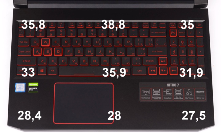 Ноутбук тестировался в помещении с температурой 23–24 °С. По ходу тестов велось наблюдение за температурой внутренних компонентов и измерялась температура внешнего корпуса.