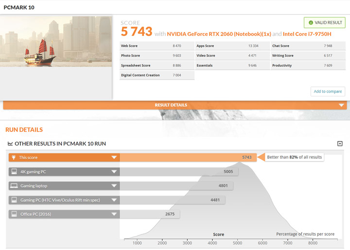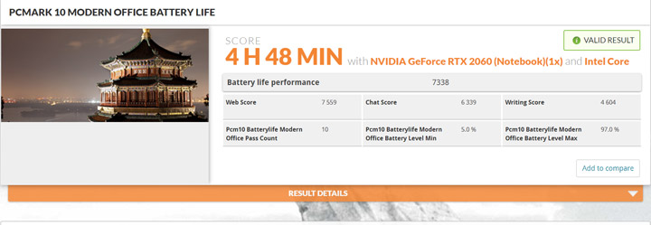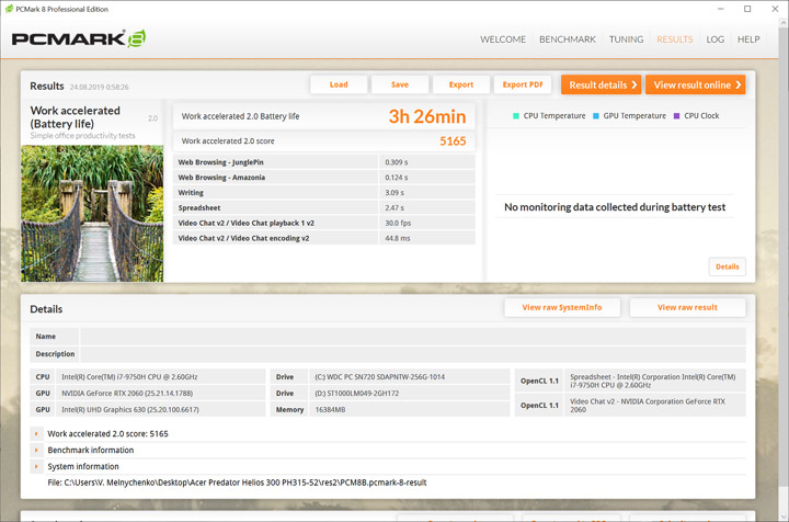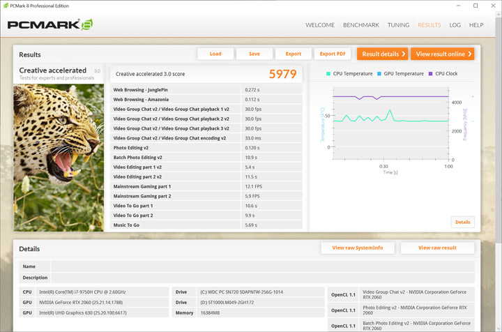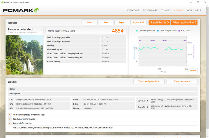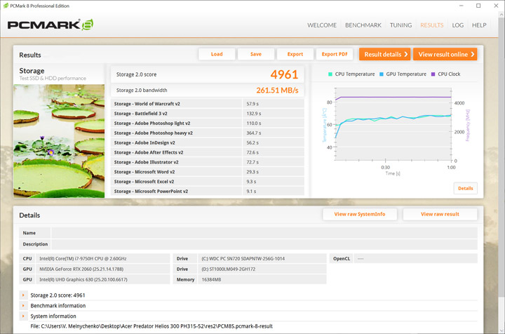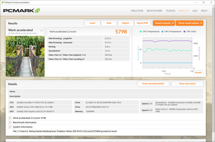 Общая производительность системы, вполне ожидаемо, находится на высоком уровне. Набранное количество баллов в рамках комплексных PCMark 8 и PCMark 10 превосходит результаты, как протестированных ранее собратьев в лице Predator Triton 500 PT515-51 и Nitro 5 AN515-54, так и результат идентичного по комплектации ASUS ROG Zephyrus M GU502. Если присмотреться к диаграммам, то можно увидеть, что центральный процессор Intel Core i7-9750H стабильно работал на частоте 4200–4500 МГц на протяжении всего тестирования, что и обеспечило отрыв от конкурентов. Это, в свою очередь, говорит о том, что система охлаждения хорошо справляется со своей задачей и позволяет ключевым компонентам ноутбука работать с полную силу своих возможностей.