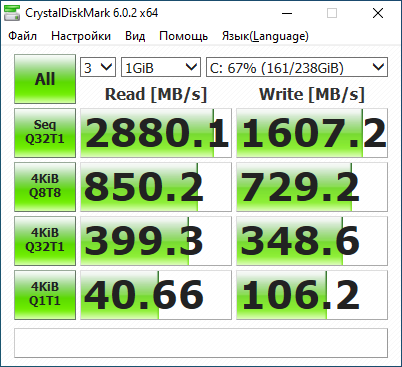 Штатный SSD демонстрирует средний, по современным меркам, уровень производительности. Пиковая скорость линейного чтения составила 2880 Мбайт/с, скорость записи ограничена на заявленном уровне в 1600 Мбайт/с. Скорость обработки блоков 4К составила 40/106 Мбайт/с.