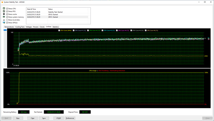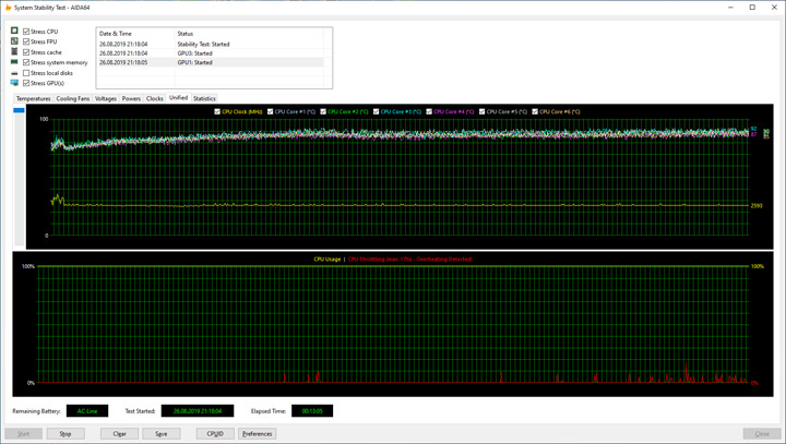 Проверка возможностей системы охлаждения проходила в помещении со стабильной температурой воздуха 24 °C. Замерялись как пиковые значений внутренних компонентов устройства, так и уровень нагрева его корпуса. Необходимую нагрузку обеспечила утилита AIDA64.