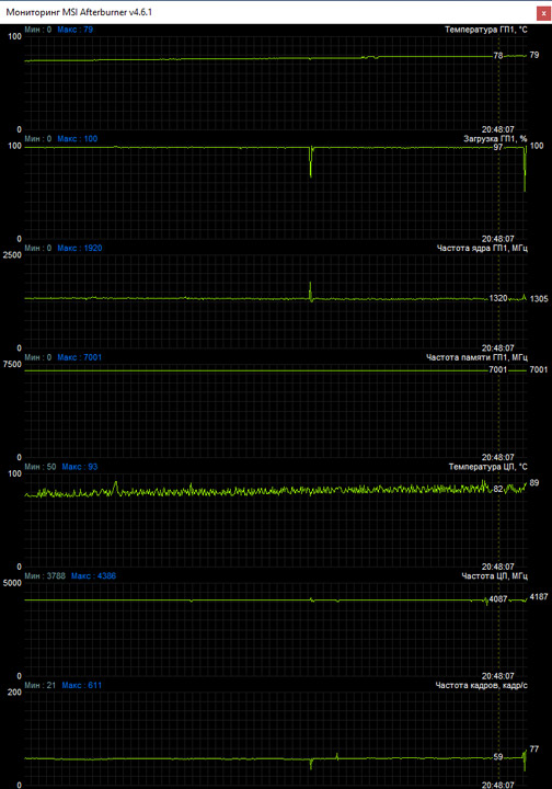 В автоматическом режиме работы вентиляторов, система охлаждениях демонстрирует вполне применимую эффективность, что подтвердили результаты тестов выше. В экстремальных нагрузках, которые мы создаем в рамках стресс-теста AIDA64, можно наблюдать кратковременные проявления тротлинга. В данном случае, имеет место быть недоработка алгоритма управления скоростью вращения вентиляторов — несмотря на постепенный рост температур, их частота вращения остается неизменной и далекой от возможного максимума.