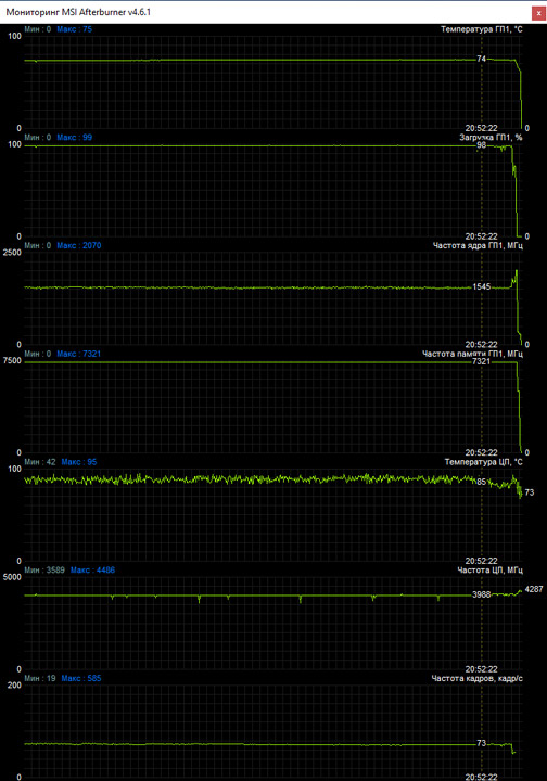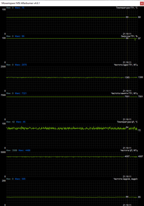 Как видим, во всех трех случаях процессор стабильно функционировал на частоте 3900–4100 МГц, а его средняя температура составляла 85–90 °C. Частота графического ядра, в зависимости от выбранного режима, находилась в диапазоне 1300–1585 МГц.