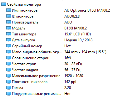 Как упоминалось в начале материала, в основе экрана лежит быстрая матрица с максимальной частотой развертки в 144 Гц и временем отклика равным 3 мс. Если быть более точным, то речь идет об IPS-панели B156HAN08.2 от AU Optronics, которая знакома нам по обзору Acer Predator Triton 500 (PT515-51). Диагональ матрицы составляет 15,6 дюйма, максимальной разрешение экрана — 1920х1080 пикселей.