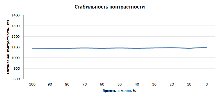 Диапазон регулировки яркости доступен в широких пределах от 18 до 323 кд/м². Коэффициент контрастности стабилен и в среднем составил 1091:1.