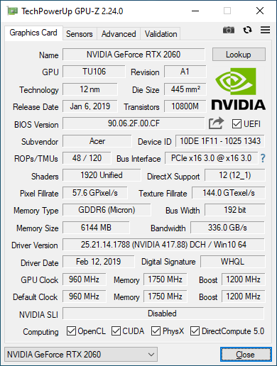 | Видеокарта | NVIDIA GeForce RTX 2060 6 ГБ |