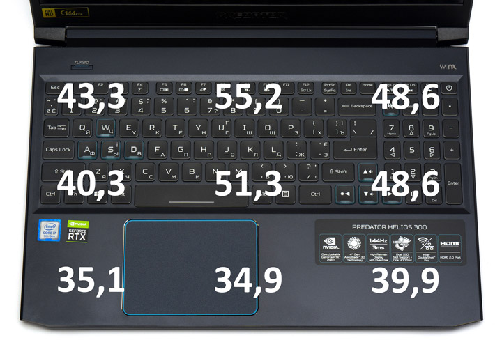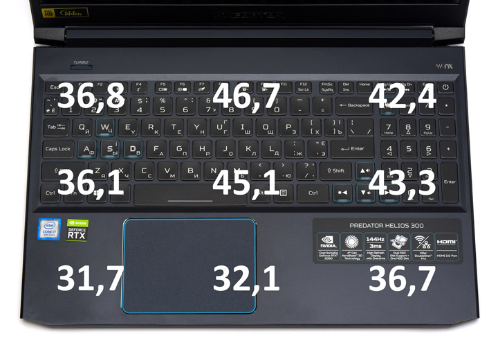 Что касается качества печати, то благодаря короткому ходу клавиш и считываемой обратной связи при их срабатывании, набирать текст за Predator Helios 300 PH315-52 можно быстро и с комфортом. Приемлемые размеры самих кнопок и достаточное количество пространства между ними способствуют отсутствию промахов или ложных нажатий во время ожесточенных игровых баталий.