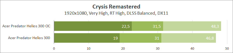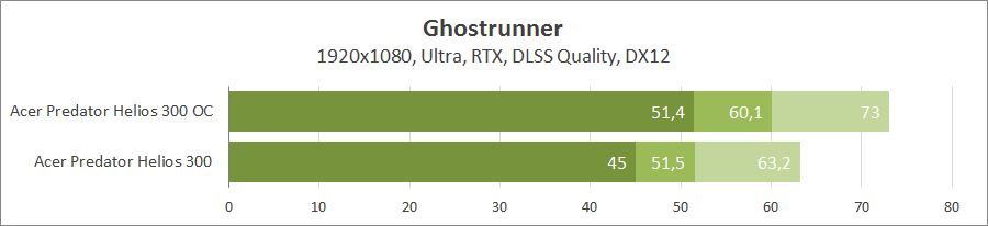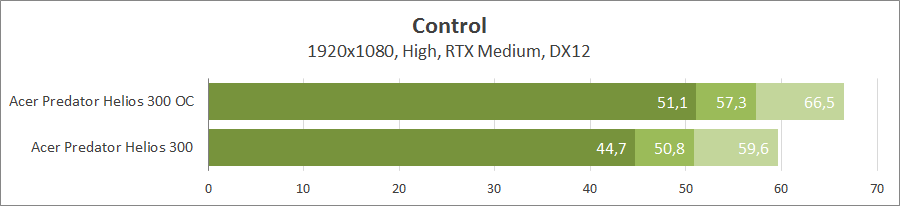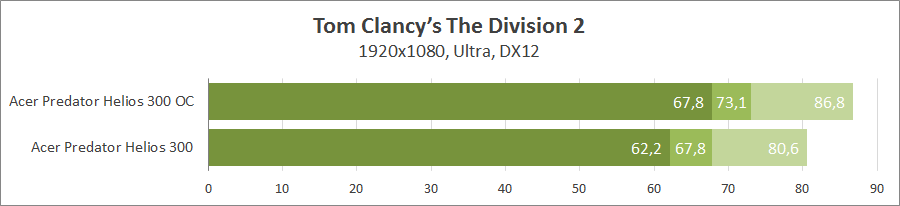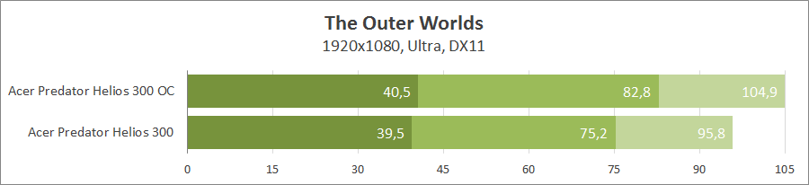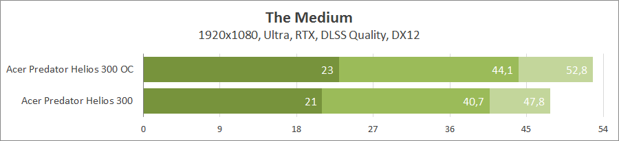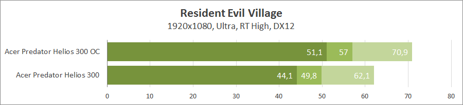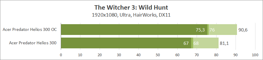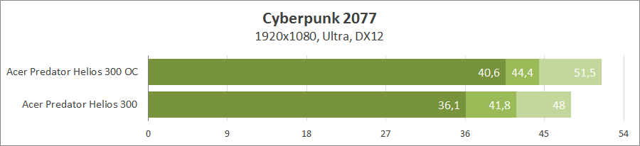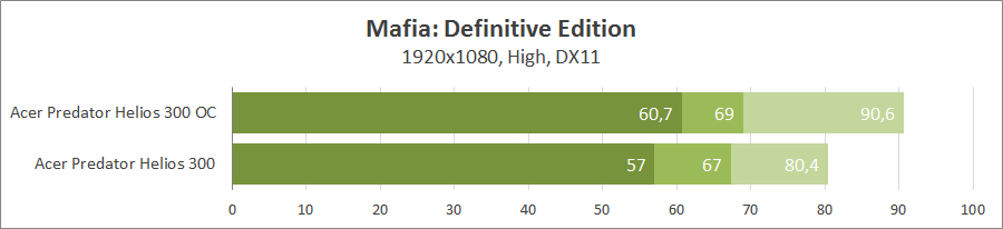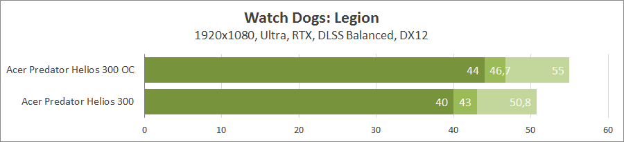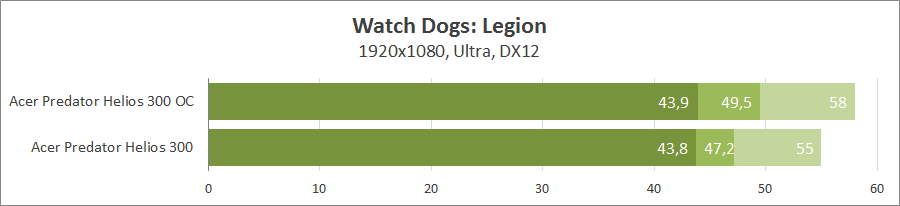 Acer Predator Helios 300 снова выдает около 60 кадров. Разгон повышает производительность на 12%.