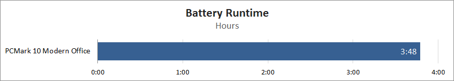 Чтобы проверить время работы от аккумулятора, мы провели испытания с помощью специализированного набора тестов PCMark 10 Modern Office, которые симулируют комбинированную офисную нагрузку. Яркость экрана зафиксирована на 120 кд/м² (20% от максимума) для сравнения показателей с другими ноутбуками.