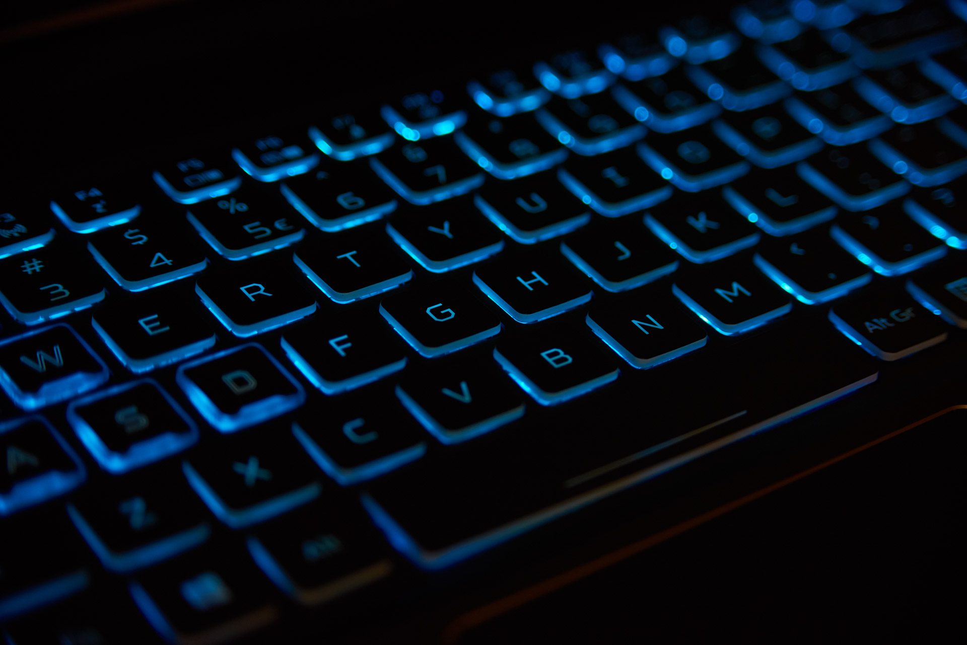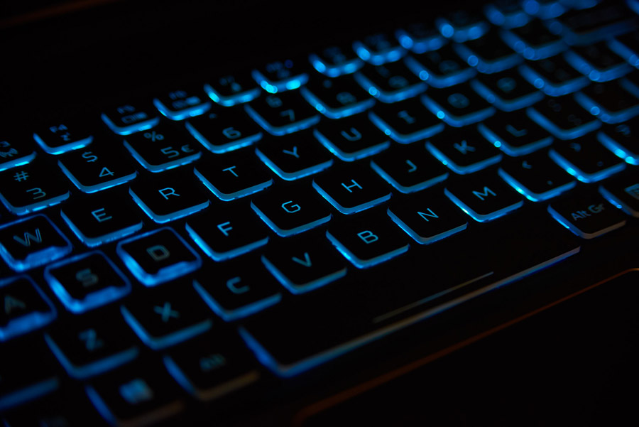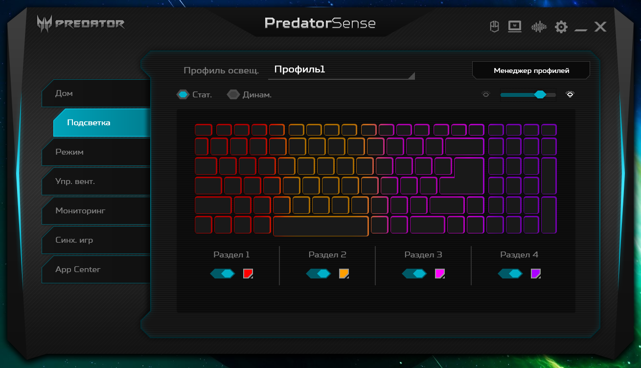 Клавиатура имеет 4-зональную RGB-подсветку. По умолчанию клавиши светятся голубым цветом, что отлично сочетается с темным корпусом. Есть эффекты поэтапной активации зон подсветки при включении и выключении. Доступна быстрая регулировка яркости с кнопок на клавиатуре.