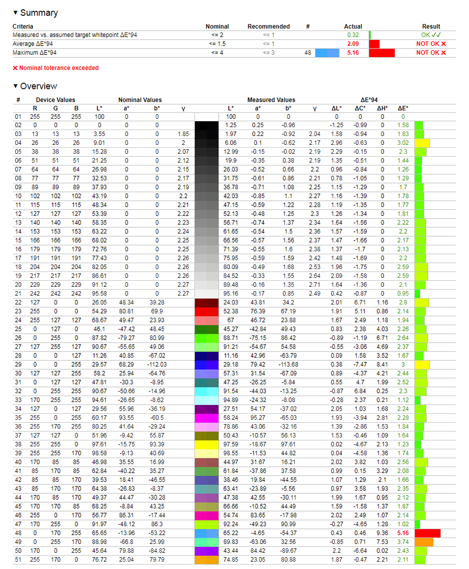 Экран показывает высокую точность цветопередачи с низким отклонением. Средний коэффициент отклонения DeltaE на уровне 2 единиц, максимальное отклонение 5 единиц.
