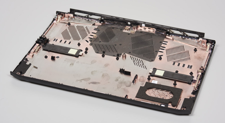 Разберем ноутбук. Нижняя часть корпуса имеет много опорных точек, чтобы избежать деформации. Центральные отверстия закрыты дополнительной решеткой. Предусмотрены радиаторы для накопителей NVMe M.2, контакт осуществляется через термопрокладки.