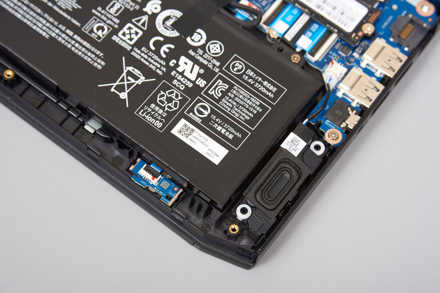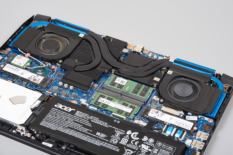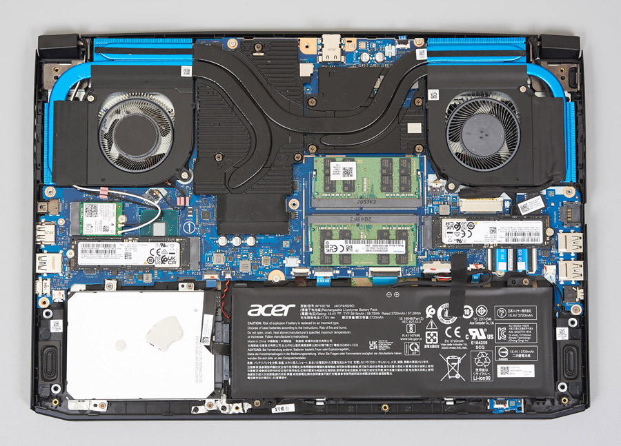 Внутренняя компоновка стандартная, общая конструкция не изменилась со времен Acer Predator Helios 300 PH315-52. Основной объем занимает плата и охлаждающая система с двумя «турбинами».