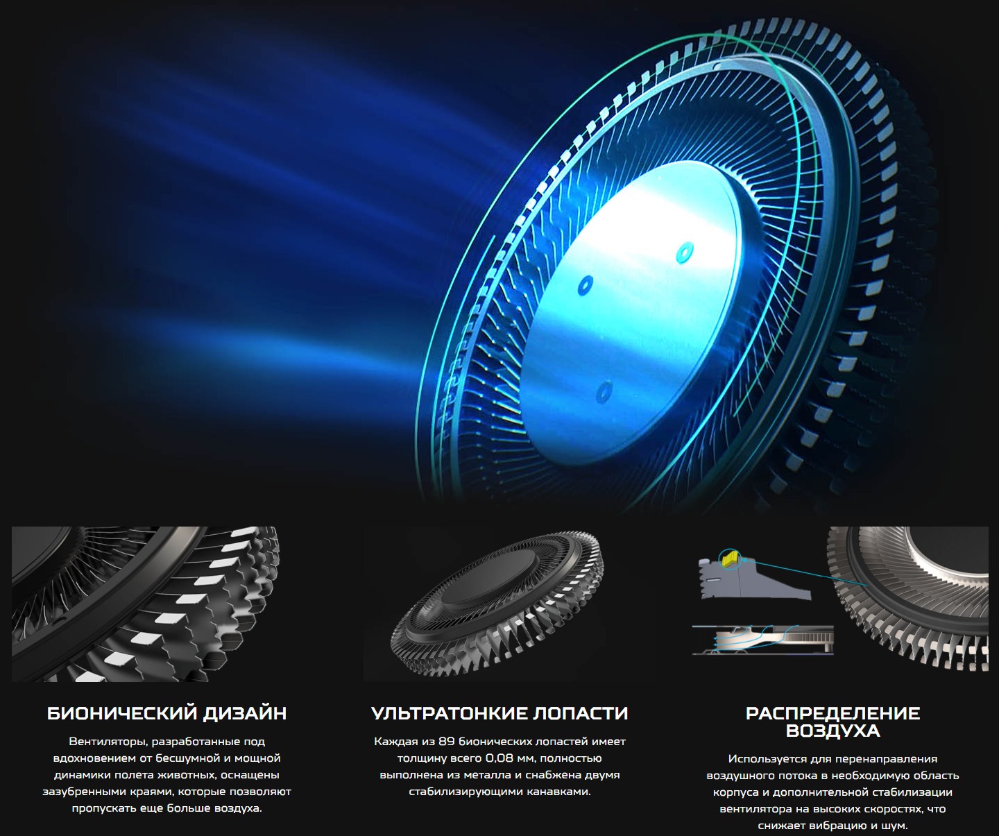 Используются специальные вентиляторы AeroBlade 3D с тонкими лопастями особой формы, с зазубринами на краях и стабилизационным кольцом. Вентилятор охлаждающего блока видеокарты имеет все особенности данного дизайн, а вентилятор процессорного блока чуть проще.