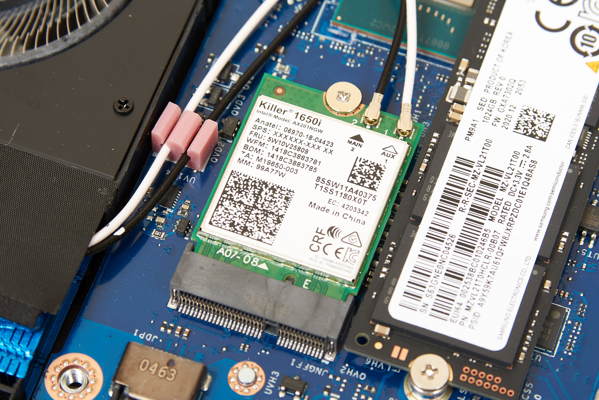 Игровой статус ноутбука подчеркивается применением специализированных сетевых контроллеров Killer. Работу беспроводных интерфейсов Wi-Fi 6 802.11ax и Bluetooth 5.2 обеспечивает Killer 1650i (Intel AX210NGW), а Gigabit Ethernet реализован на базе Killer 2600.