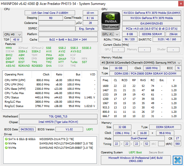 Процессор Intel Core i7-11800H является младшей моделью в линейке 8-ядерных мобильных CPU нового поколения с TDP 45 Вт. Он выполнен по технологии 10 нм SuperFin и насчитывает 8 ядер на архитектуре Willow Cove, которые обрабатывают 16 потоков данных. Кэш-память L3 увеличена до 24 МБ. Максимальная частота в Boost-режиме может достигать 4,6 ГГц. 32 ГБ памяти DDR4-3200 работают в двухканальном режиме с задержками 22-22-22-52-1T.