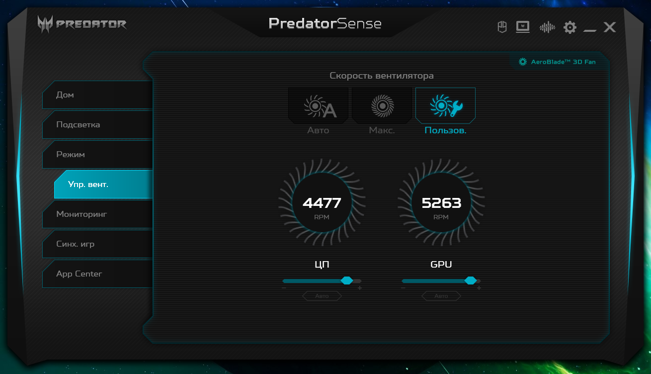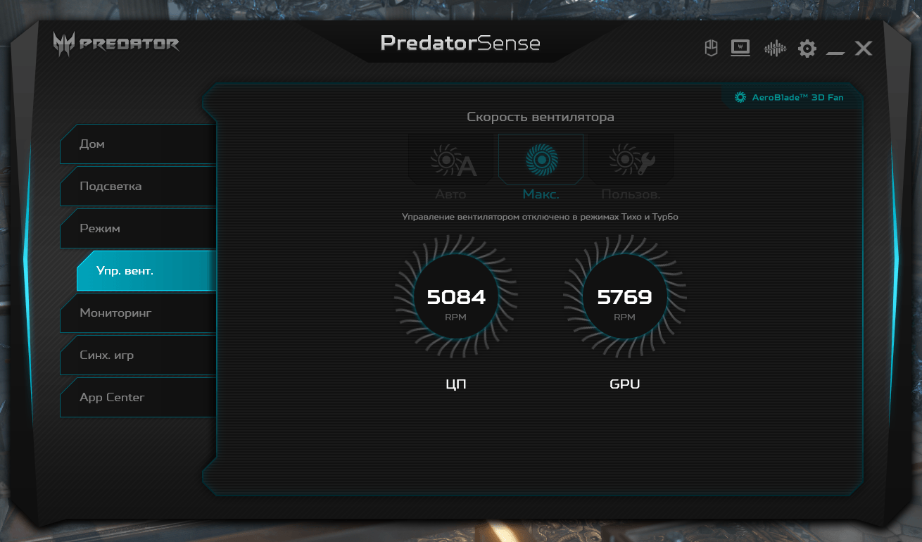 Ключевой программой для пользователя является Acer PredatorSense. Она предоставляет функции мониторинга температуры, загрузки и прочих параметров. Есть переключение рабочих режимов, где вместо стандартного «По умолчанию» можно выбрать тихий режим, экстремальный и «Турбо». Последние два предполагают некоторое ускорение за счет повышения лимитов мощности, но основное их преимущество в лучшем охлаждении, что повышает стабильность на высоких частотах. Turbo-режим переключает вентиляторы на 100%, он же активируется кнопкой с клавиатуры.