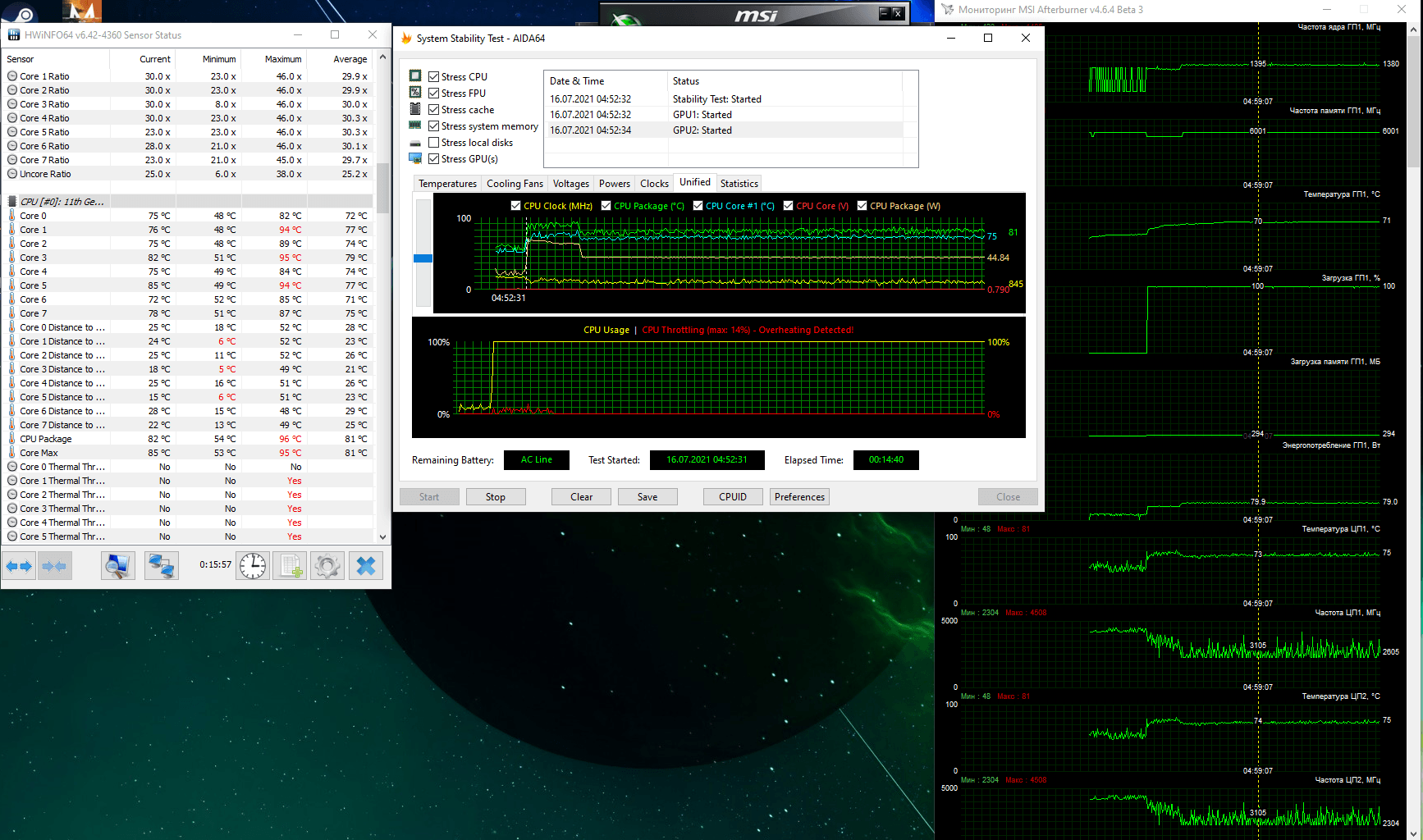 Вначале процессор стартует с высоких частот, достигая пиковых температур в 94-95 °С. Постепенно частоты снижаются до 2,8-3 ГГц при рабочих температурах около 80 °С. Графический процессор прогревается до 71 °С. Скорость вентиляторов 4000-4700 об/мин.