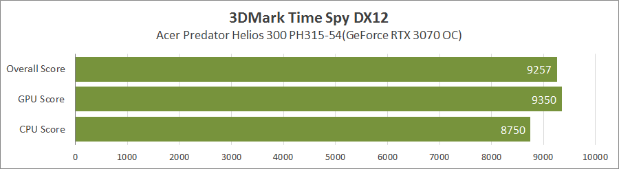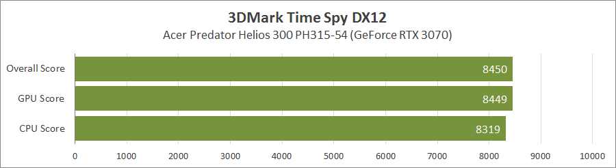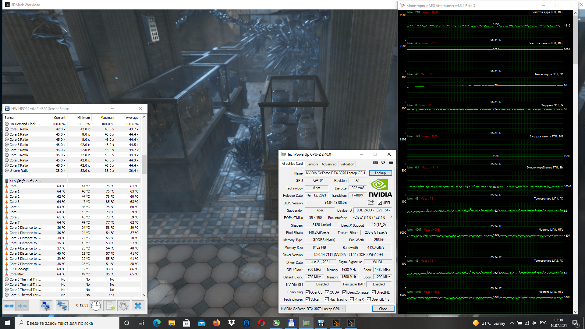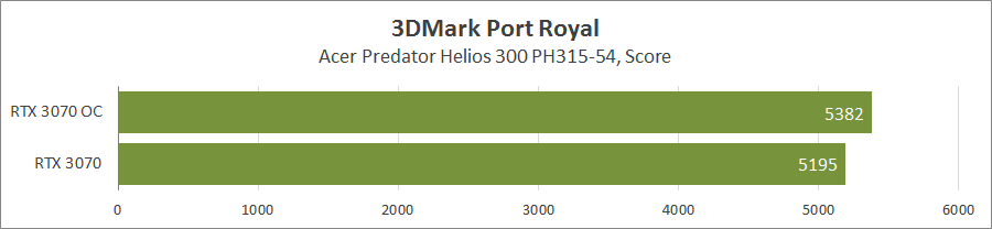 Общие показатели соответствуют невысоким частотам энергоэффективной версии GeForce RTX 3070. GPU Score на 21% ниже результата GeForce RTX 3070 в ноутбуке MSI GE66 Raider 10UG. Разгон добавляет к результату 11%.