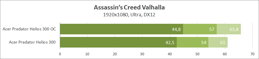 В Valhalla ноутбук обеспечивает 60 кадров в Ultra-режиме. Разгон ускоряет на 8%.