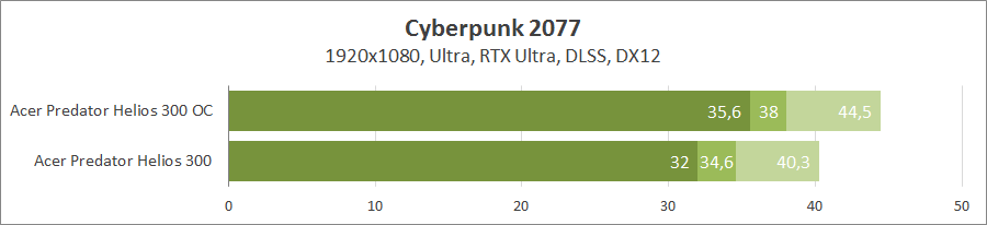 В нативном разрешении Full HD ноутбук выдает до 60 кадров, разгон ускоряет на 7%. Недавнее обновление добавило в игру технологию DLSS, что позволит дополнительно поднять производительность и избавит от просадок в тяжелых сценах.