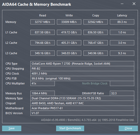 Ноутбук оснащен двумя планками памяти DDR4-2133 (тайминги 15-15-15-35 CR2), которые работают в двухканальном режиме. Это обеспечивает высокие показатели в тесте памяти.