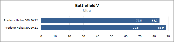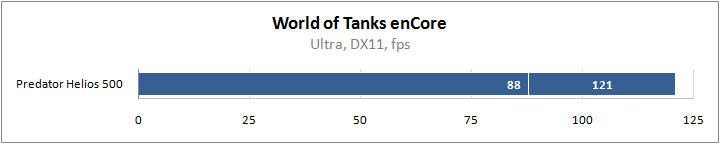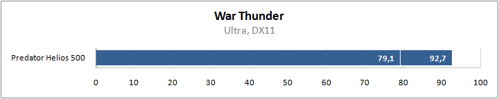 Если вы любитель онлайновых сражений боевой техники, то Predator Helios 500 обеспечит полный комфорт в War Thunder. При максимальных настройках графики (все ползунки на пределе) встроенный тест «Танковое сражение» показывает 80–90 fps.