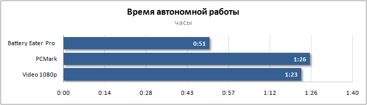 Также проверено время автономной работы при воспроизведении видео Full HD 1080p и при помощи специальной утилиты Battery Eater Pro v2.70, которая рендерит простую 3D-сцену в низком разрешении. Все данные сведены вместе в один график.
