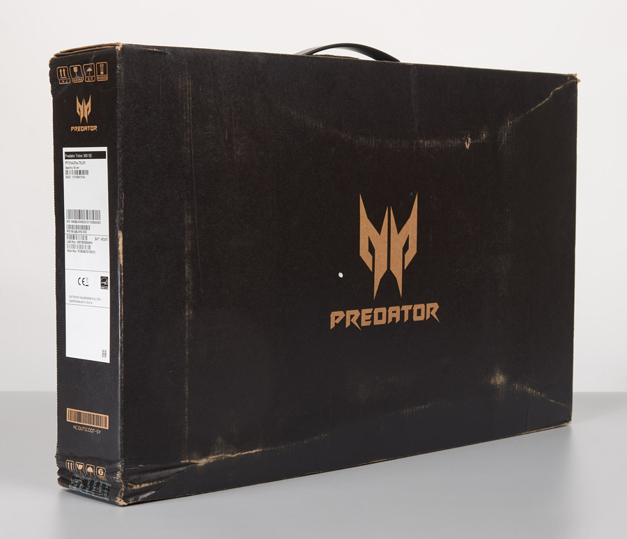 Ноутбук поставляется в черной картонной коробке. Наш тестовый вариант оказался с «пробегом» и коробка немного помята, что никоим образом не сказалось на работоспособности устройства.