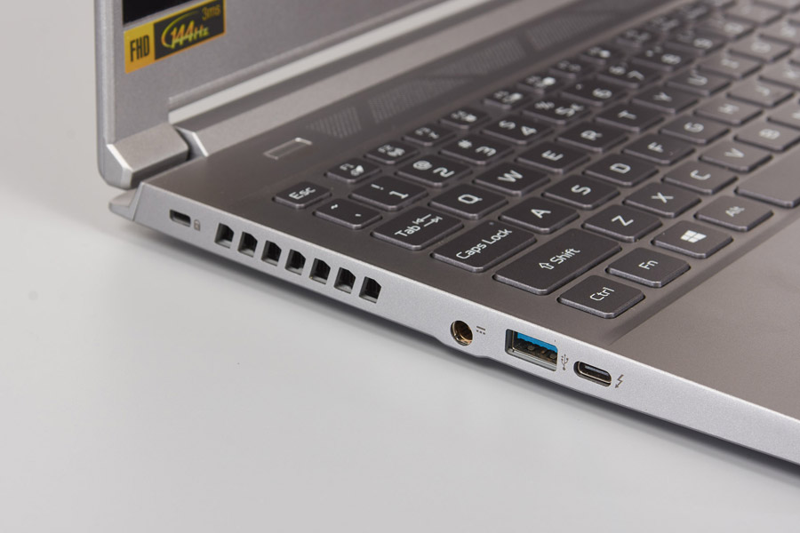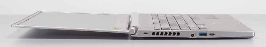 С левой стороны ноутбука присутствуют разъемы Kensington Lock, разъем подключения внешнего питания, полноформатный USB 3.2 Type-A и USB 3.2 Type-C, который может использоваться в качестве интерфейса Thunderbolt 4 и DisplayPort.