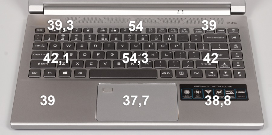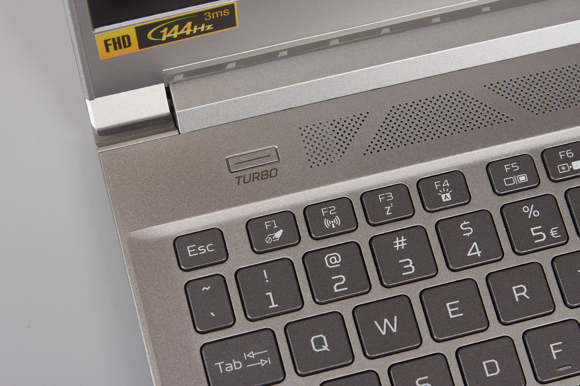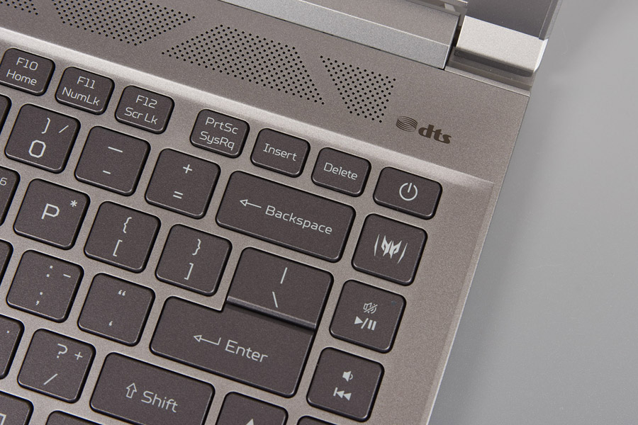 Над клавиатурой в корпусе сделана перфорация для притока воздуха. Кнопка включения расположена в общем ряду верхних клавиш. Рядом находится клавиша вызова приложения Acer PredatorSense, под ней клавиши регулировки громкости и навигации для медиаплееров.