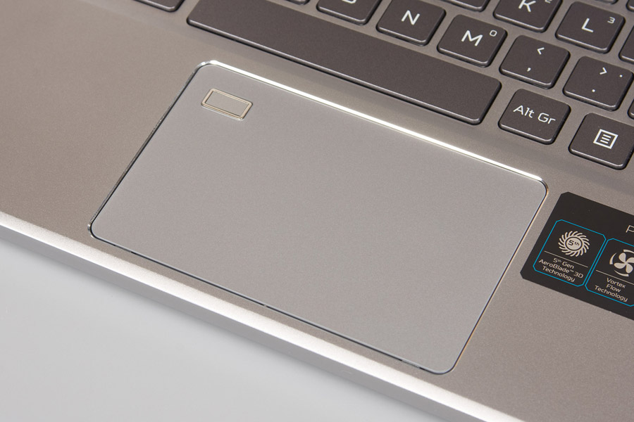 Тачпад с кнопками выполнен в виде единой панели. В сенсорную панель встроен сканер отпечатков пальцев.