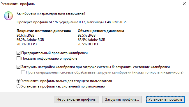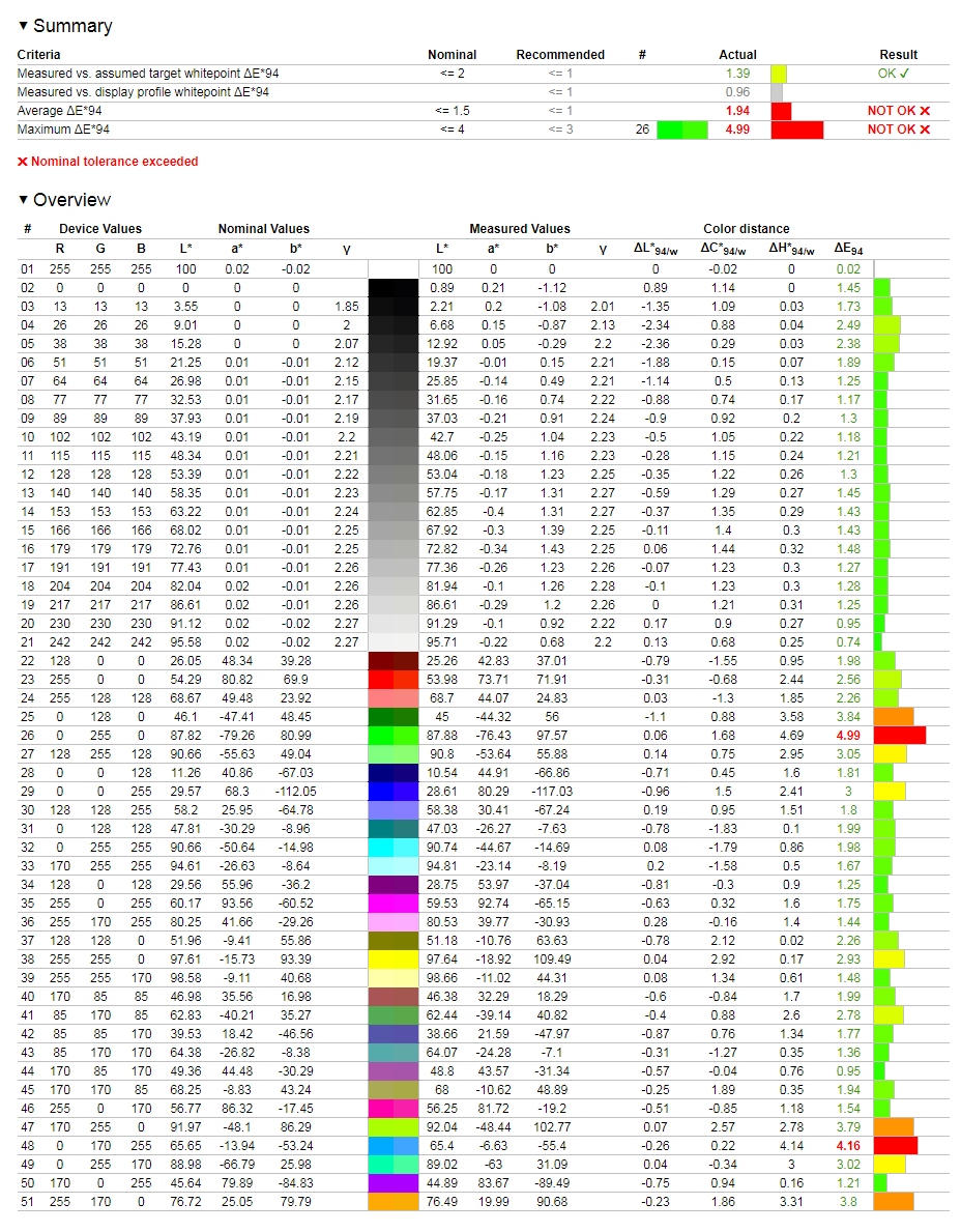 Экран показывает высокую точность цветопередачи с отклонением DeltaE менее 2 единиц, что является хорошим результатом.