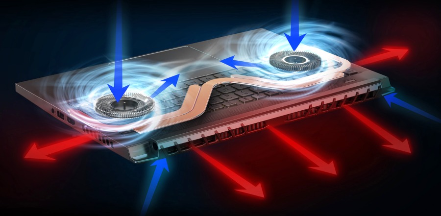 Конструкция ноутбука предусматривает создание направленных воздушных потоков для оптимального охлаждения компонентов и внешнего корпуса.