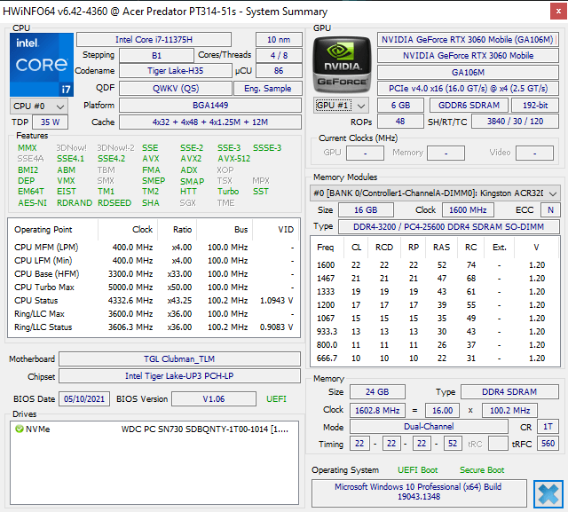 Acer Predator Triton 300 SE PT314-51S использует мобильный процессор Intel Core i7-11375H семейства Tiger Lake на техпроцессе 10 нм. Он насчитывает четыре ядра с Hyper-Threading, что позволяет обрабатывать восемь потоков, TDP до 35 Вт. Память DDR4-3200 работает в двухканальном режиме с задержками 22-22-22-52-1T.