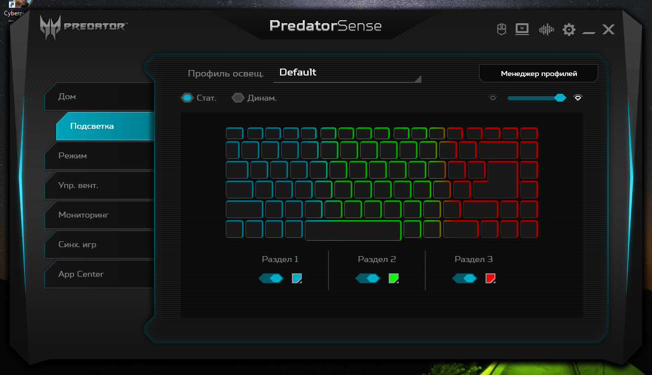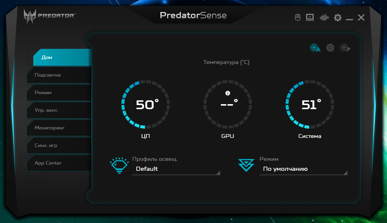 Как и все игровые ноутбуки Acer, данная модель имеет широкие программные возможности для настройки рабочих параметров. В этом помогает приложение Acer PredatorSense, для вызова которого предусмотрена отдельная клавиша на клавиатуре. На первой вкладке выводятся данные температурного мониторинга с возможностью выбора профилей подсветки и рабочего режима.