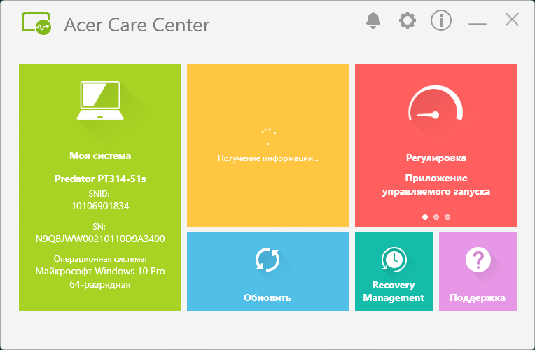 Приложение Acer Care Center позволяет контролировать обновления системы и приложений, обеспечивает быстрый доступ к службам восстановления и некоторым другим функциям.