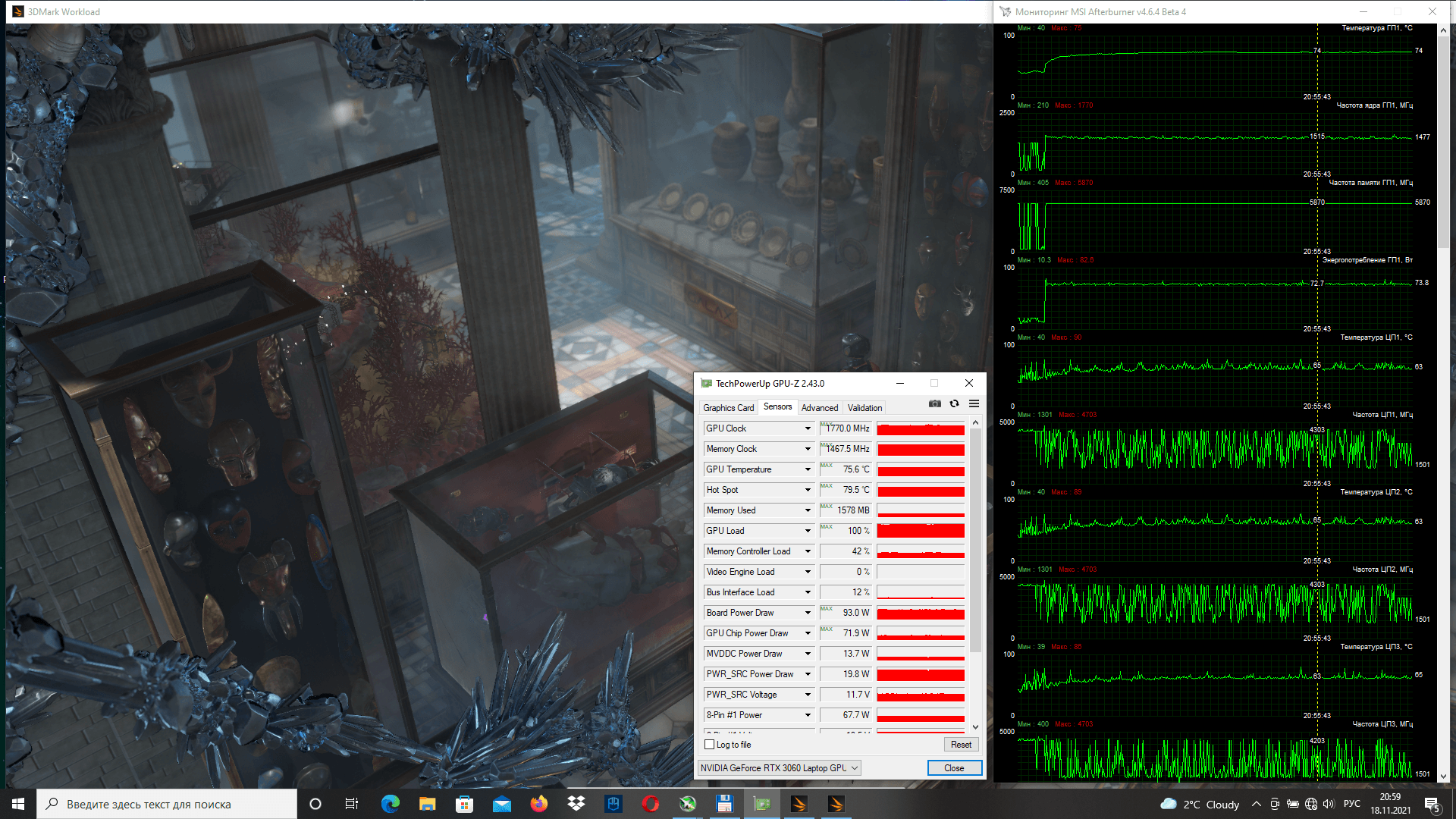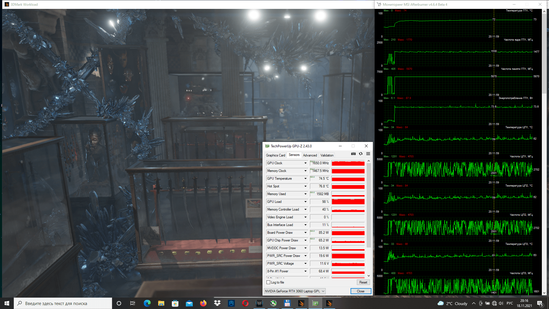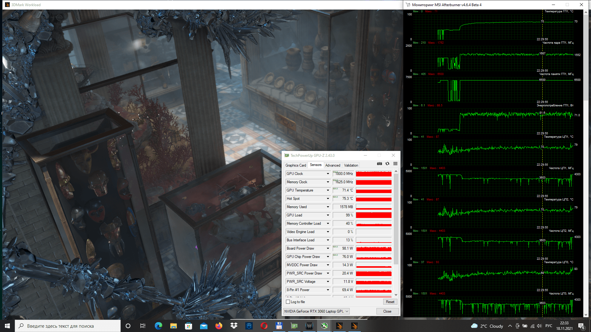 В таком режиме температура GPU достигала 75 °С при частотах Boost около 1500 МГц. Процессор Intel Core i7-11375H прогревался до пиковых значений около 90 °С, хотя средние рабочие температуры были ближе к 70–80 °С. Ядра показывали разгон выше 4 ГГц, пиковые значения до 4,7 ГГц. Максимальная скорость процессорного вентилятора не превышала 3900 об/мин, вентилятор GPU раскручивался до 4100 об/мин.
