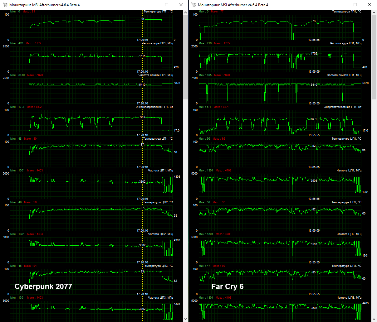 Традиционно мы решили испытать мобильную видеокарту и при повышенных частотах. Но вначале детальнее рассмотрим особенности ее работы в стандартном режиме. Ниже скриншот мониторинга при длительной нагрузке в Cyberpunk 2077 и Far Cry 6. В первой игре частоты GPU на стандартном уровне 1500 МГц, а частота ядер CPU около 3,3 ГГц. Во второй игре видеокарта показывает буст выше 1700 МГц, а процессор демонстрирует частоты 3,5–4 ГГц. Частота памяти у видеокарты стабильно снижается до 5410 МГц (10820 МГц).