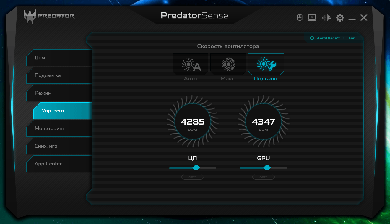 У Acer нет плавной регулировки рабочих алгоритмов вентиляторов. Настройки в Acer PredatorSense предусматривают фиксированную скорость. Но при начальной скорости около 4300 об/мин в пиковые моменты мониторинг показывал до 5000 об/мин. Режим «Турбо» предусматривает 5900 об/мин, что уже слишком громко.