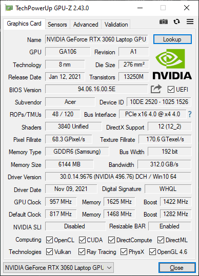 Процессор имеет встроенную графику Intel Iris Xe, особенности которой мы разбирали ранее. Она используется при низкой нагрузке в 2D-режиме. За обработку графику в 3D отвечает видеокарта NVIDIA GeForce RTX 3060. Мобильная версия базируется на GPU106 с 3840 потоковыми ядрам CUDA против 3584 ядер CUDA у десктопной GeForce RTX 3060. При этом мобильная видеокарта работает на низких частотах с сильно урезанным TDP. В данном случае перед нами экономичная версия Max-Q. Заявлена мощность 60 Вт с максимальным значением до 90 Вт. Базовая частота GPU 817 МГц при Boost Clock 1282 МГц. Память GDDR6 работает на 192-битной шине при частоте 11740 МГц, объем памяти — шесть гигабайт.