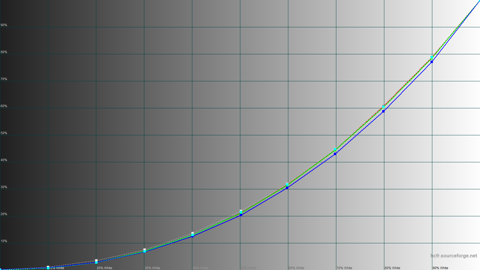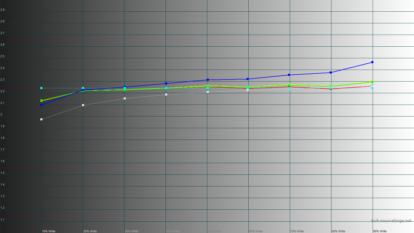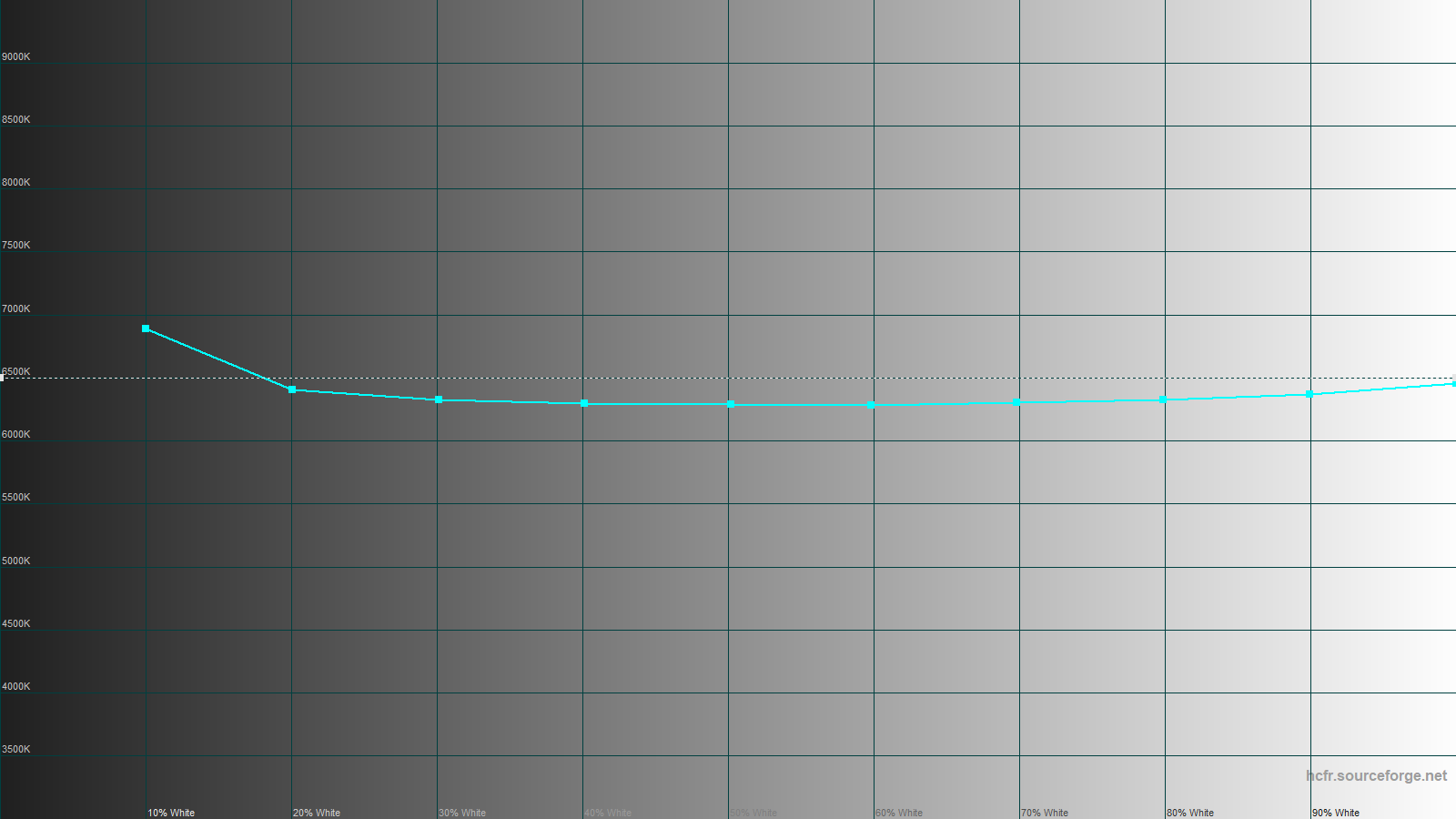 Цветовая температура близка к оптимальному уровню в 6500K с небольшим смещением в сторону теплых тонов. Отклонение гамма-кривых небольшое.